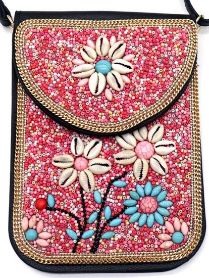 Wat deze tas zo bijzonder maakt, is de combinatie van glaskralen en schelpen in verschillende kleuren en vormen. De glaskralen zijn zorgvuldig geselecteerd en met de hand bevestigd, wat elke tas een uniek en persoonlijk karakter geeft. De schelpen voegen een vleugje natuurlijke charme toe en creëren een prachtig contrast met de glanzende kralen.